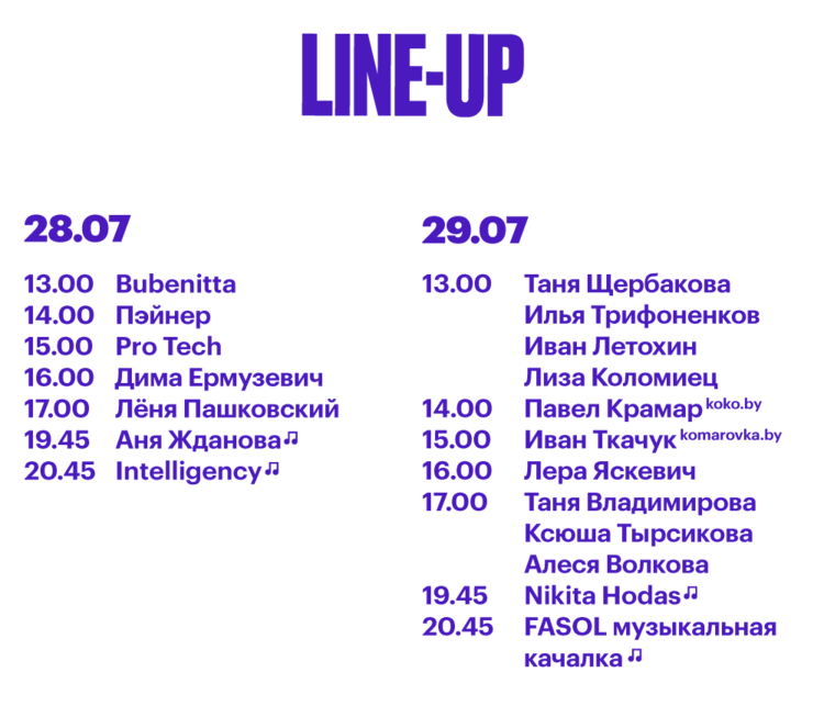 Четыре сцены и 35 музыкальных шоу! Сцены фестиваля представлены сразу несколькими прогрессивными направлениями — indie, idm, experimental, house, post-rock и др. FSP открывают для Беларуси культовых и новых европейских музыкантов, впервые привозя их в этот регион. Конечно же, тут можно познакомиться с лучшей современной музыкой, сделанной и в Беларуси за последние годы. Более 240 музыкантов из 20 стран уже выступили на сценах FSP и это только начало.