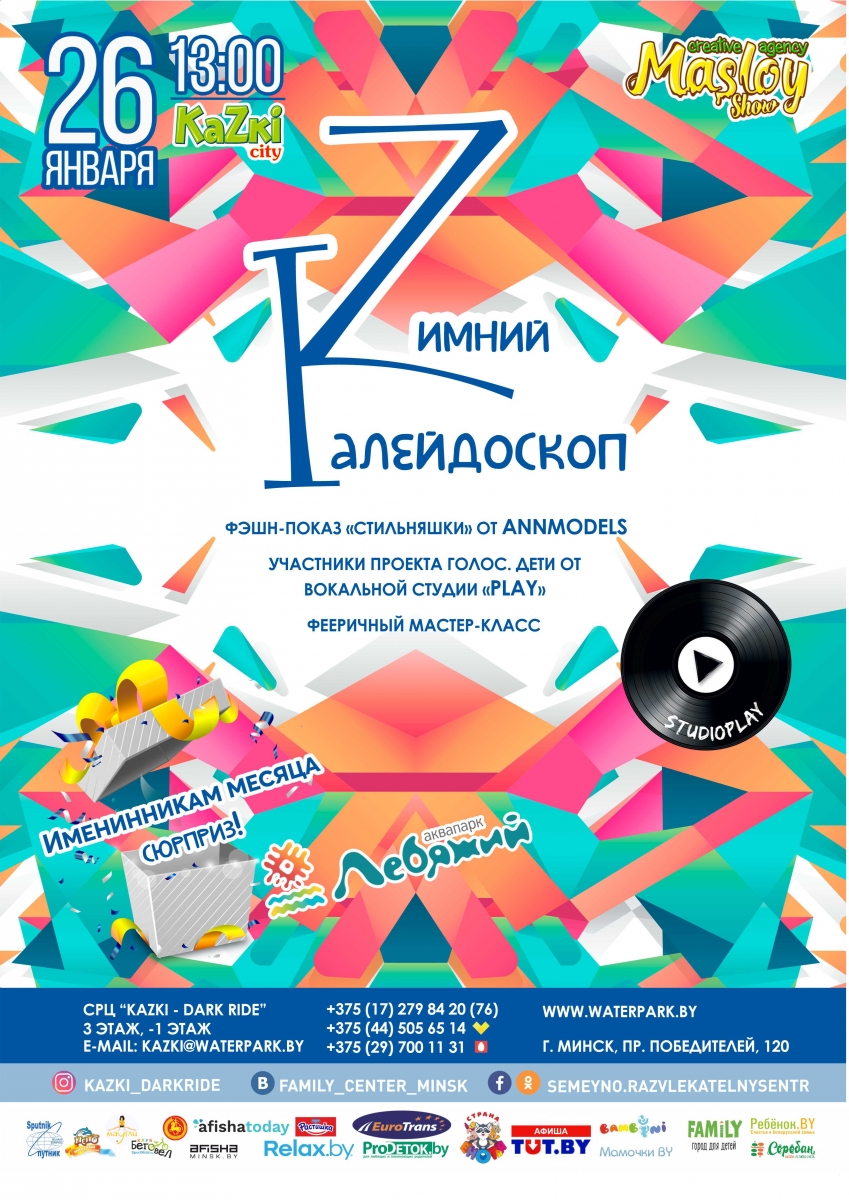 26 января в 13.00 Детский центр «Kazki» (3 этаж) в аквапарке «Лебяжий» приглашает всех мальчишек и девчонок на крутейшую и первую в этом году шоу-программу «Зимний калейдоскоп».